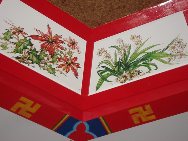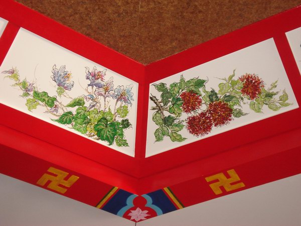 寺院彩绘 佛像墙绘 寺庙 庙宇手绘墙以佛教内容为题材。常见的有释迦牟尼佛和黄教始祖宗喀巴传记、故事画,历代藏王、大师的肖像,四大天王、十八罗汉以及礼佛图等。图案多为西蕃莲、梵文、宝相花、石榴花和吉祥八宝纹(海螺、宝伞、双鱼、宝瓶、宝花、吉祥结、胜利幢、法轮)等。它一方面受到尼泊尔和印度犍陀罗、波斯等文化风格影响,结合本民族图腾和苯教的图案发展而成。