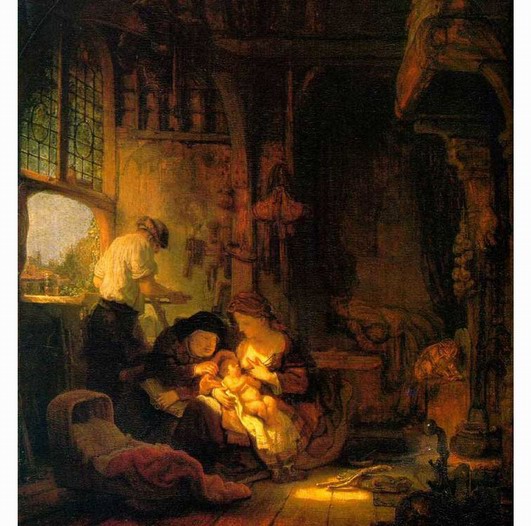 《木匠家庭/圣洁的家庭》给我们描绘的是一个温馨木匠的家庭。在作品中,女主人正在专注地给怀里的婴儿哺乳,一旁的老太太也许是女主人的母亲,正慈爱地注视着孩子。男主人背朝她们,低头做着手中的活儿。婴儿是作品的中心的点,吸引了所有观赏者的目光。他通体发亮,使观赏者产生一种错觉,似乎哪婴儿才是光源的所在。木制的地板露出了裂痕,钉子依稀可见。光线冲淡了高高屋宇下的幽暗,那些陈旧的木质雕花饰物上有尘埃的痕迹。空气中则弥漫着一股淡淡的奶香,夹杂着阳光和尘埃的气味。整幅作品给我们展现出的是温馨,自然,令人向往,陶醉。